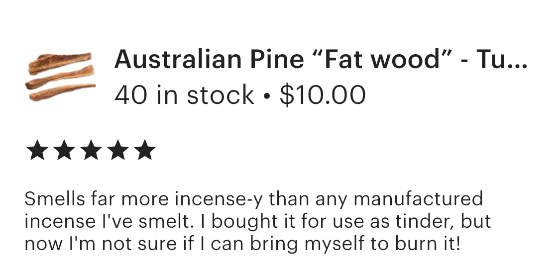 Turpentine, the resin produced has an amazing fragrance that is immediately noticeable by smelling the wood. The super high resin wood also emits a slight fragrance when left in the open but is not suitable for using as an incense due to its highly flammable nature. We also stock steam distilled Turpentine Oil for perfumery uses.