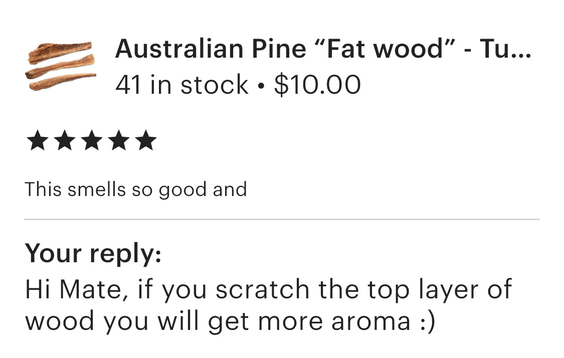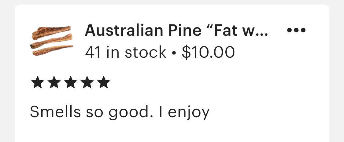 Turpentine, the resin produced has an amazing fragrance that is immediately noticeable by smelling the wood. The super high resin wood also emits a slight fragrance when left in the open but is not suitable for using as an incense due to its highly flammable nature. We also stock steam distilled Turpentine Oil for perfumery uses.